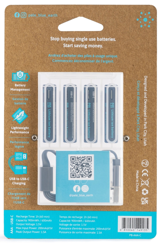 - Ingebouwde LED-laadindicator: Pale Blue batterijen geven aan wanneer ze volledig zijn opgeladen.