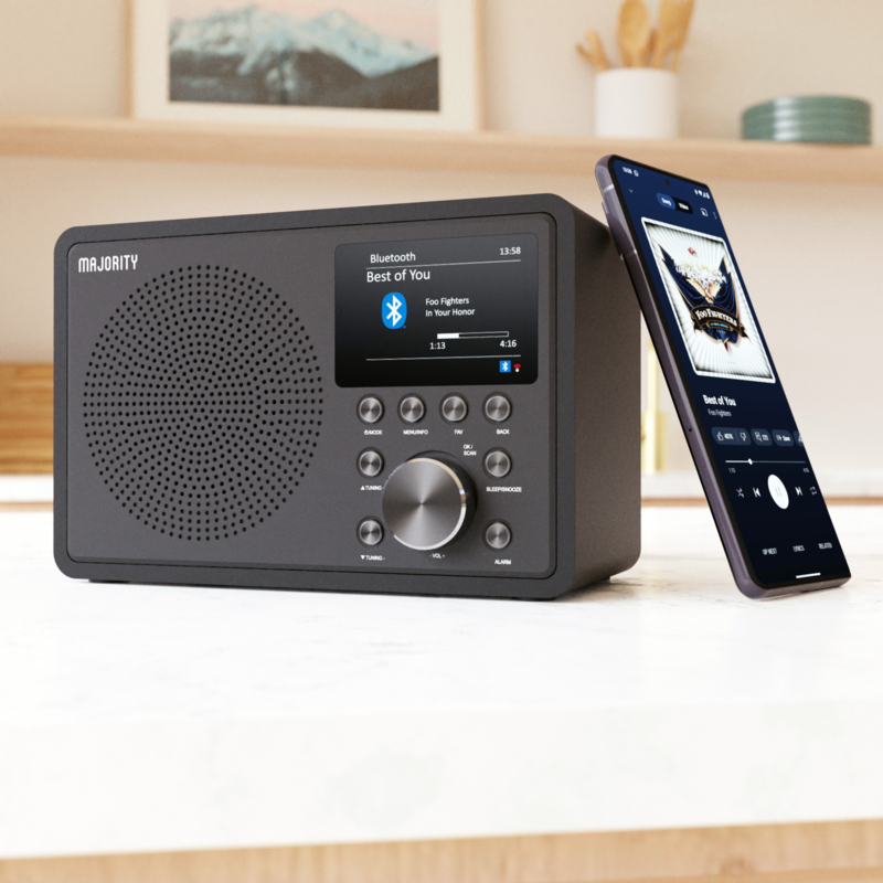 De Majority Touro is een compacte digitale radio met internet, DAB+ en FM, voorzien van Spotify Connect, Bluetooth ontvangst, dubbele wekkers en een kleuren scherm.